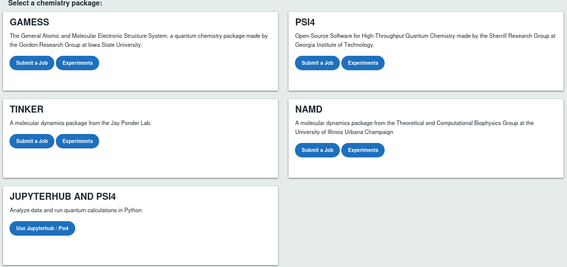 The Chem Compute website allows students to easily access state-of-the-art computational software for free. Our hope is that this will enable faculty to incorporate computational chemistry into their undergraduate teaching and research curriculum without the hassle of compiling, installing, and maintaining software and hardware. Instructors are encouraged to use this site in their classes. The service is completely free and you don’t need to ask permission.