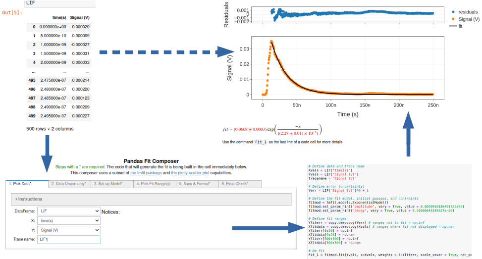 This package provides GUI tools to help the user construct Pandas and Python expressions to create things such as new calculated columns, plots or fits. The tools are meant to run in an interactive Jupyter notebook. Currently, they only work in the classic Jupyter notebook and not Jupyter lab. All tools are based on Jupyter widgets.